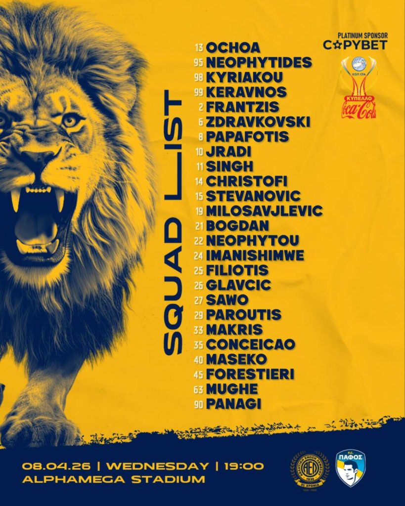 Η Αελ Λεμεσού ανακοίνωσε την αποστολή της ενόψει του πρώτου ματς με την Πάφο για τα ημιτελικά του κυπέλλου coca-cola.