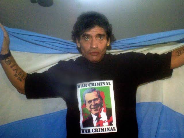 Ήταν ο γνωστός επαναστάτης ο Ντιεγκίτο και συναντιόταν δημόσια με ηγέτες όπως ο Φιντέλ Κάστρο και ο Ούγκο Τσάβεζ. Είχε τατουάζ του Τσε Γκεβάρα. «Ήταν μια πρόκληση. Ένα συναίσθημα. Θέλησα να πω ότι αυτός δεν ήταν τρομοκράτης, όπως λένε στην πατρίδα μου. Εκεί λένε ότι είναι τρομοκράτης, εξαιτίας των ιδεών του. (…) Μη με κοροϊδεύετε. Οι τρομοκράτες είναι άλλοι. Όλοι αυτοί οι πολιτικοί που σήμερα έχουν τεθεί σε κατ’ οίκον περιορισμό, που έχουν κλιματισμό, που τρώνε και πίνουν κάθε μέρα ό,τι θέλουν», έλεγε για το τατουάζ του. Αργότερα, στο αριστερό του πόδι θα προστεθεί και η εικόνα του Φιντέλ.