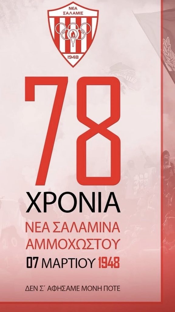 Η Νέα Σαλαμίνα κλείνει σήμερα 7 Μαρτίου 78χρόνια ένδοξης ιστορίας. Η ανακοίνωση των ερυθρόλευκων: Χρόνια Πολλά ΝΕΑ ΣΑΛΑΜΙΝΑ ΑΜΜΟΧΩΣΤΟΥ – 78 Χρόνια ένδοξης Ιστορίας. Αμμόχωστος, 7 Μαρτίου 1948. Η ημέρα που ιδρύθηκε η ΝΕΑ ΣΑΛΑΜΙΣ ΑΜΜΟΧΩΣΤΟΥ. Μια ημερομηνία ορόσημο όχι μόνο για την ιστορία του Σωματείου μας, αλλά και για την ιστορία της ίδιας της […]